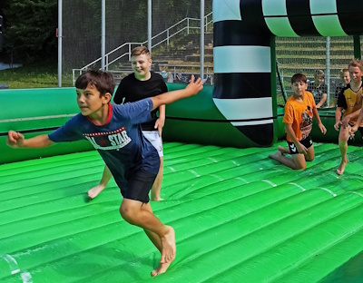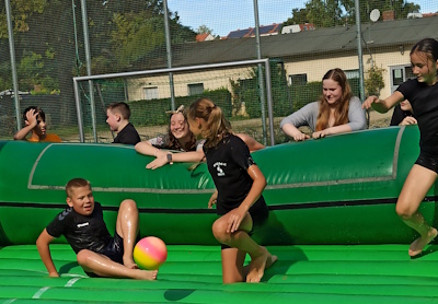 Jeweils drei Schüler einer Klasse standen sich auf dem hüpfburg-artigen Feld für ein paar Minuten gegenüber und versuchten unter glitschigen Bedingungen das Runde ins Eckige zu besorgen. Da war Geschick, Körperbeherrschung und Teamgeist gefragt und der Spaß kam für Aktive und Zuschauer nicht zu kurz.
